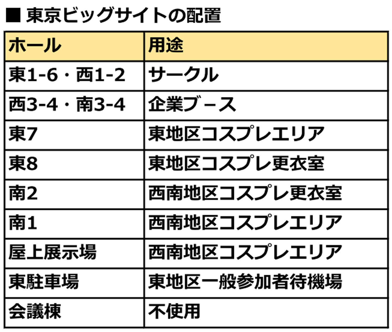 こちらが、準備会から発表された東京ビッグサイトの配置。C101と大きく異なるのは、企業ブースとコスプレ更衣室である(表はコミックマーケット公式サイトのデータを元に編集部で作成)