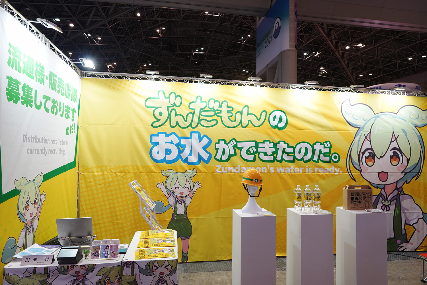イベント企画・運営、広告代理業務、クリエイティブ事業など、マルチエンターテインメントで活躍している「C-MIX」ブースでは、防災グッズとして「ずんだもんの水」を展示。2024年の夏から発売されるとのことで、今回は参考出展となっていた。