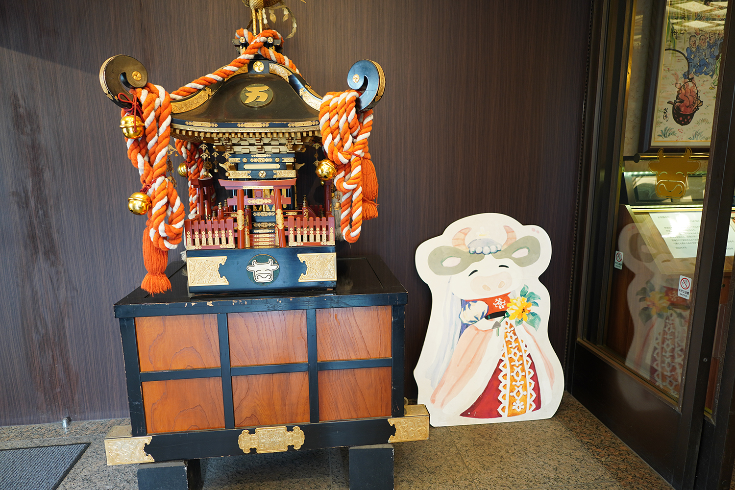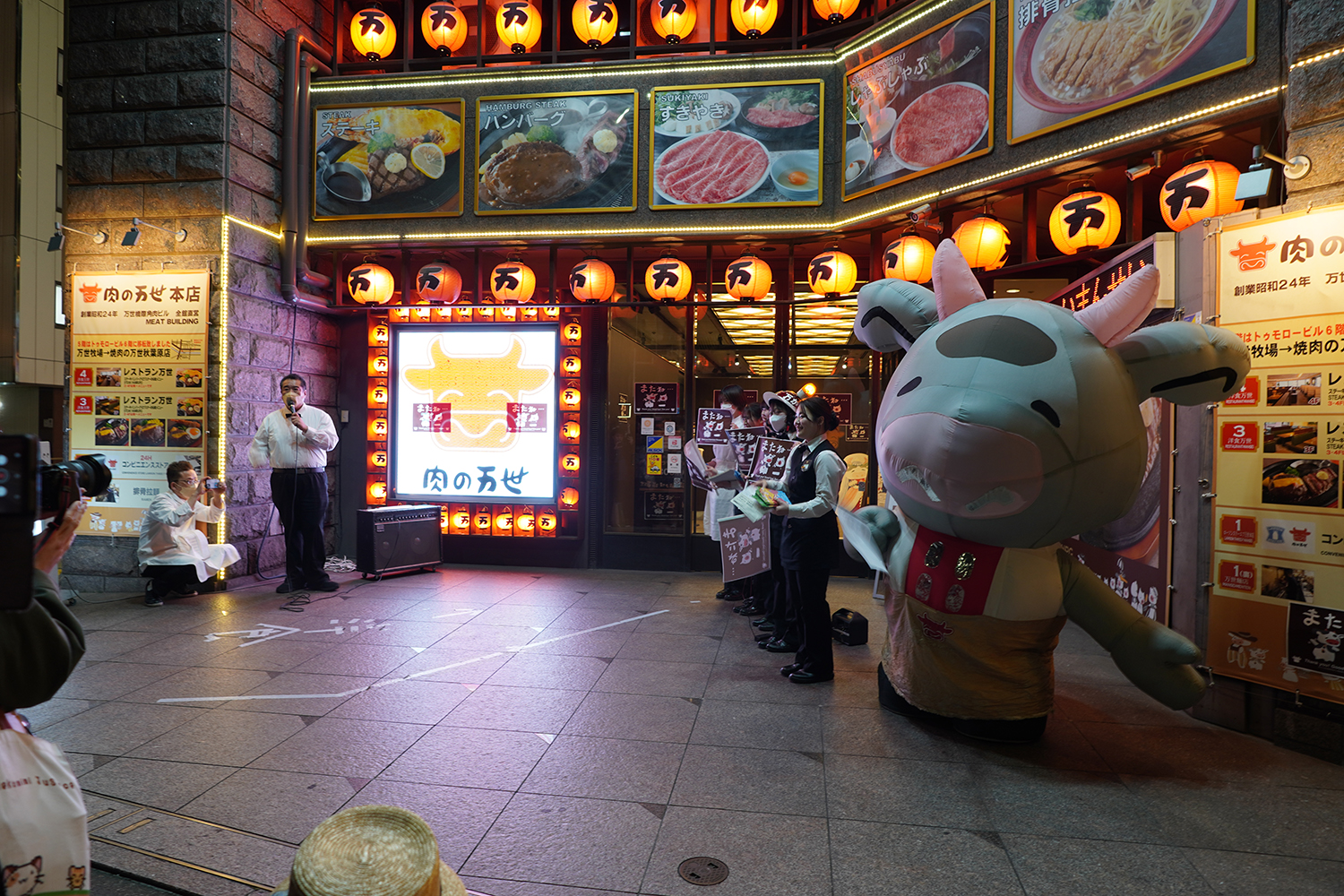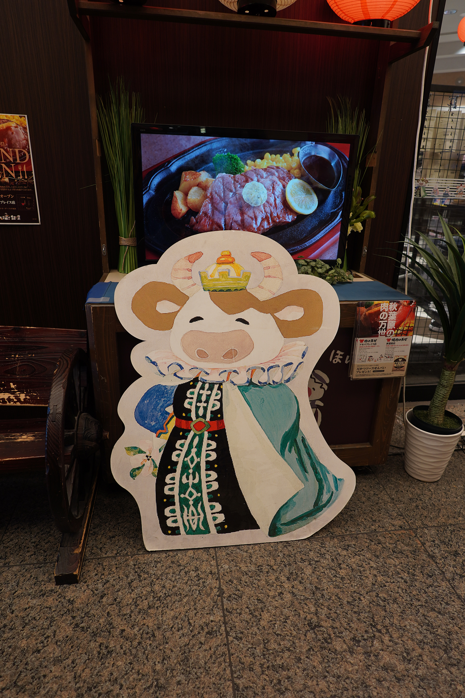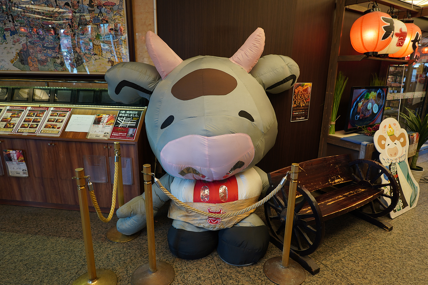 ビルの1Fのエントランスでは肉の万世のキャラクター「モーちゃん」や、ほかのキャラクターたちが展示されている。こんなにたくさんキャラクターがいたのかと再認識。