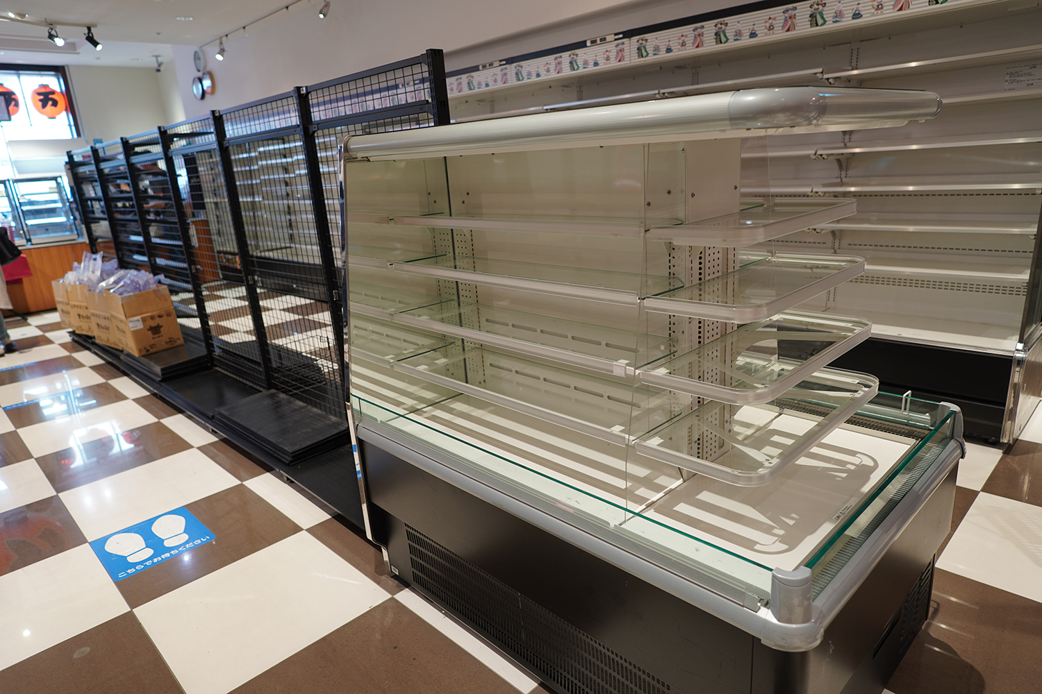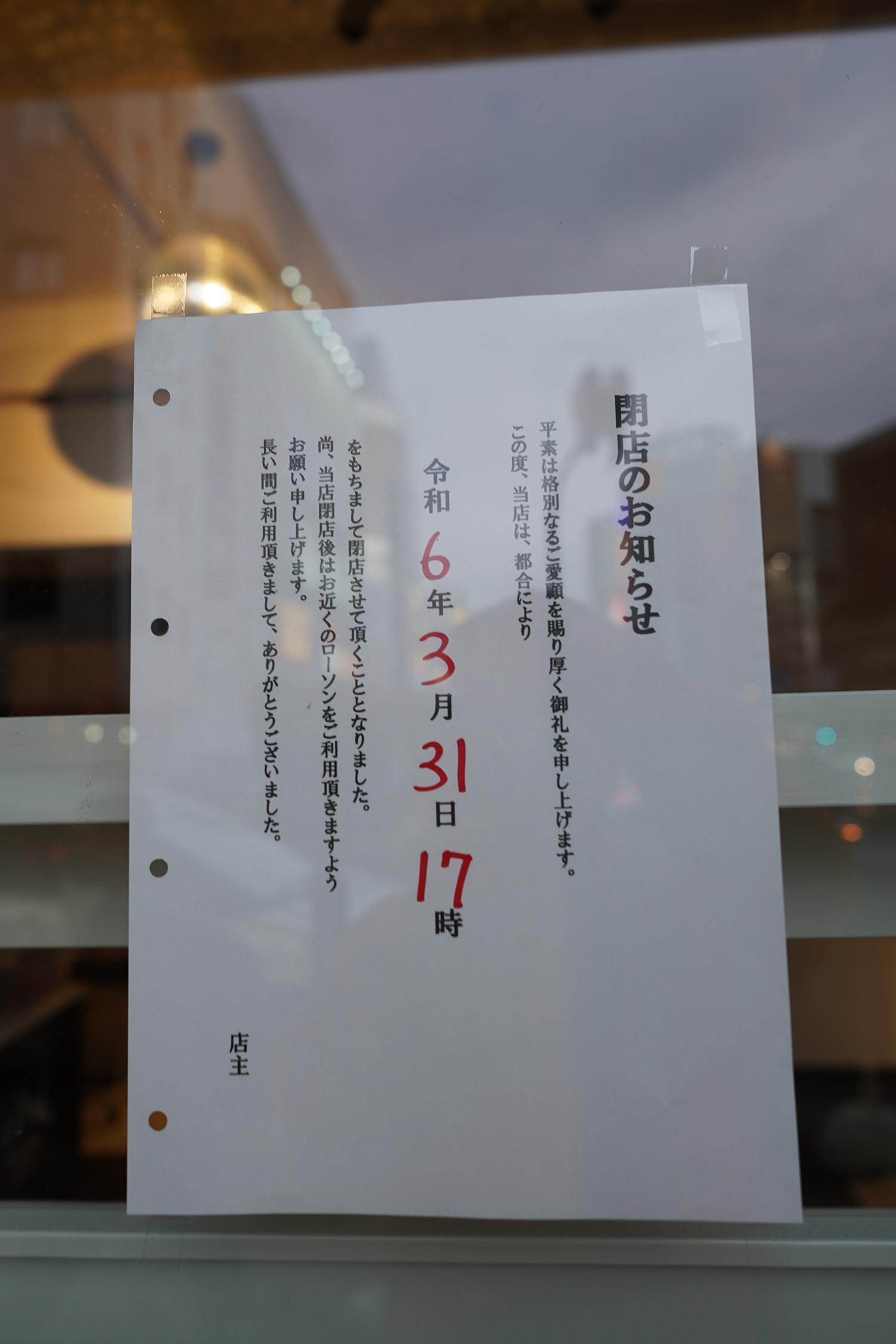 また、1Fで営業していたコンビニは17時には閉店。店内はほとんど商品がなくグッと心に来るものがある。LEDでは「33年間のご愛顧 誠にありがとうございます。」と感謝を伝えていた。