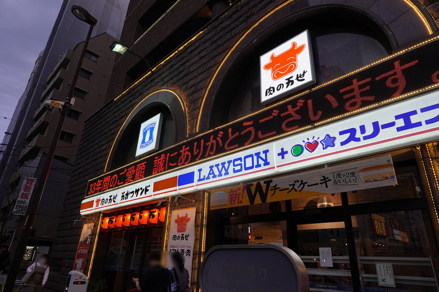 日が落ちてからは1Fで営業していたコンビニが17時に閉店。LEDでは「33年間のご愛顧 誠にありがとうございます。」と感謝を伝えていた(筆者撮影)