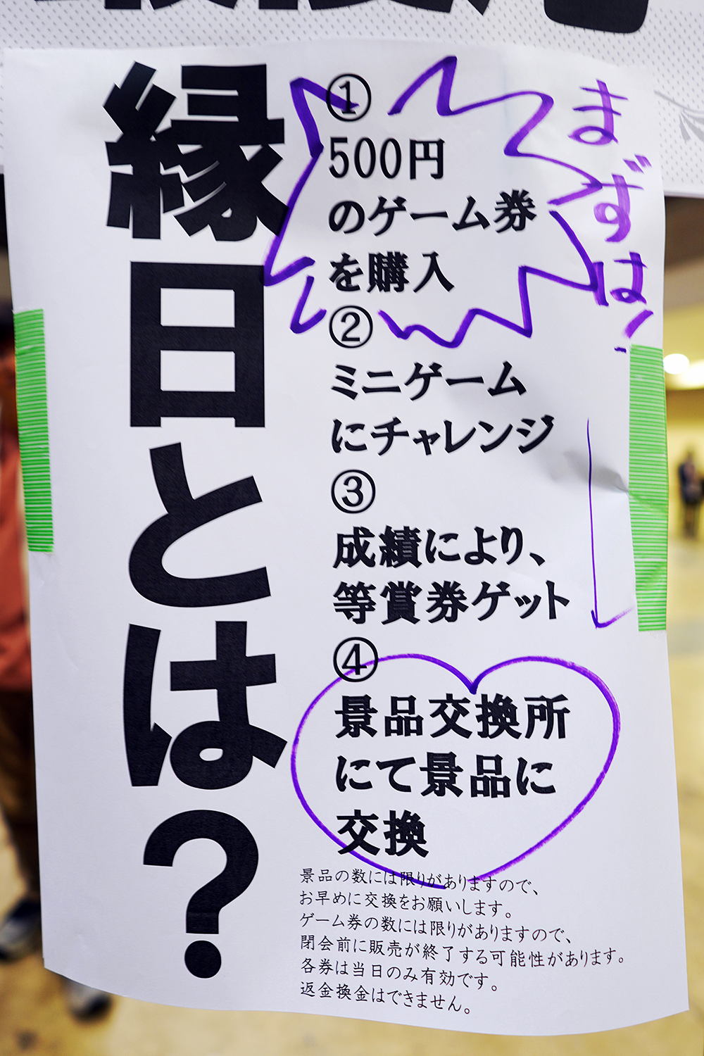 例大祭の恒例となっている縁日では射的やスマートボール、ダルマ落としなどが行われていた。1回500円(税込)で遊ぶことができ、結果によって豪華賞品がもらえるため、多くの参加者が長蛇の列をなしていた。