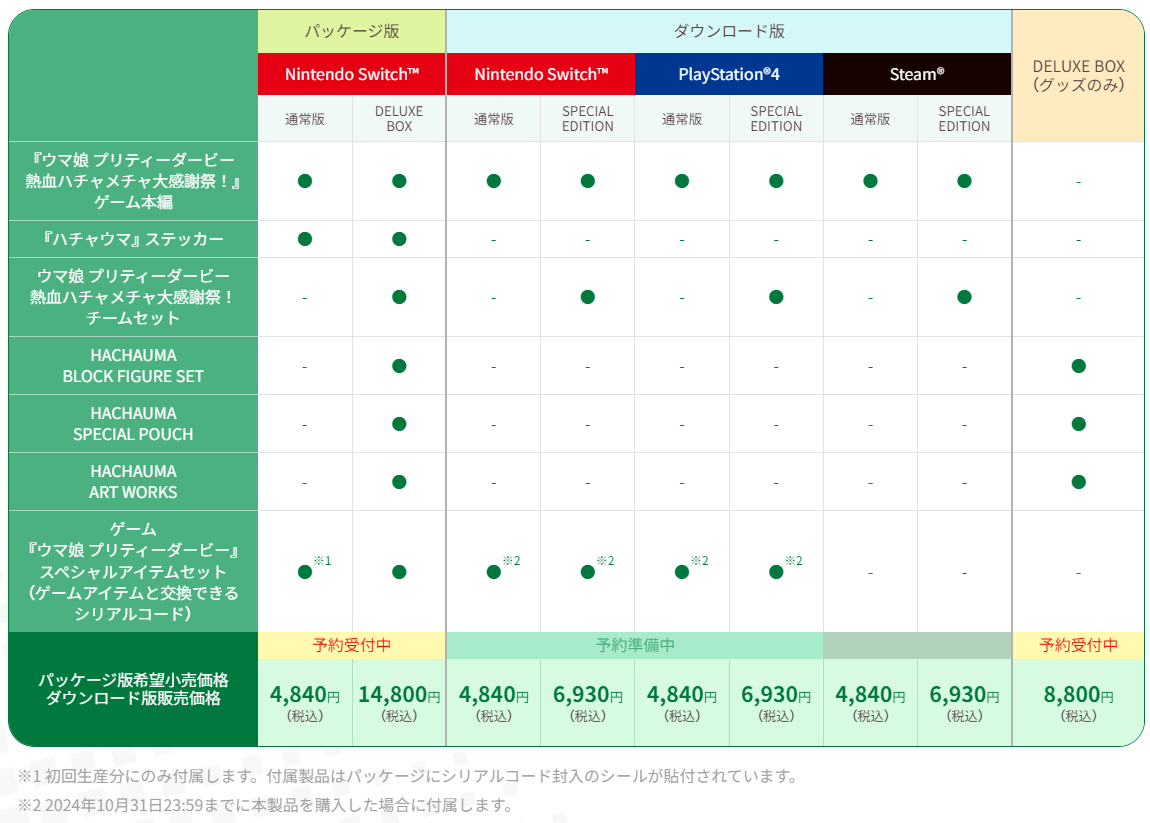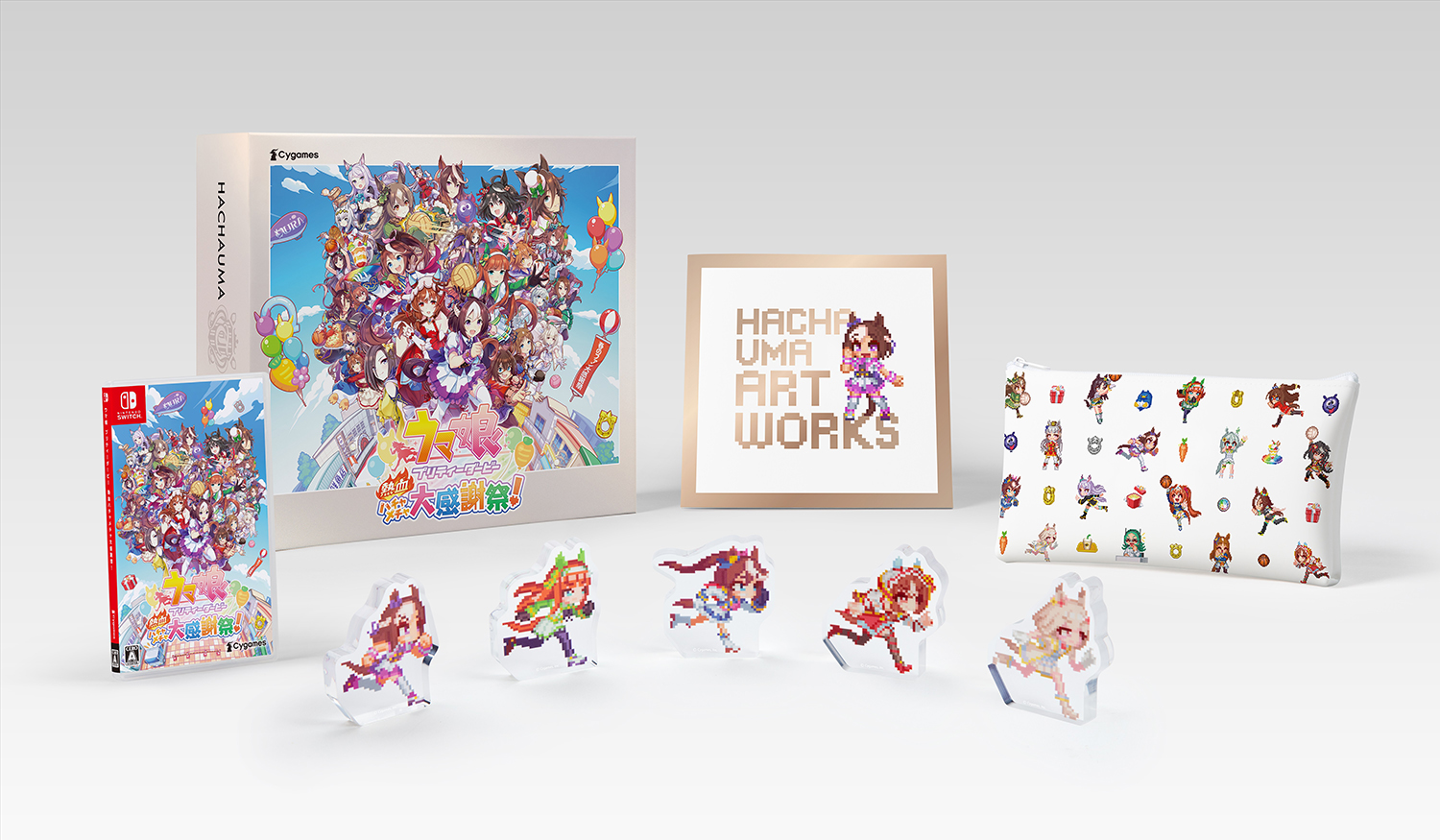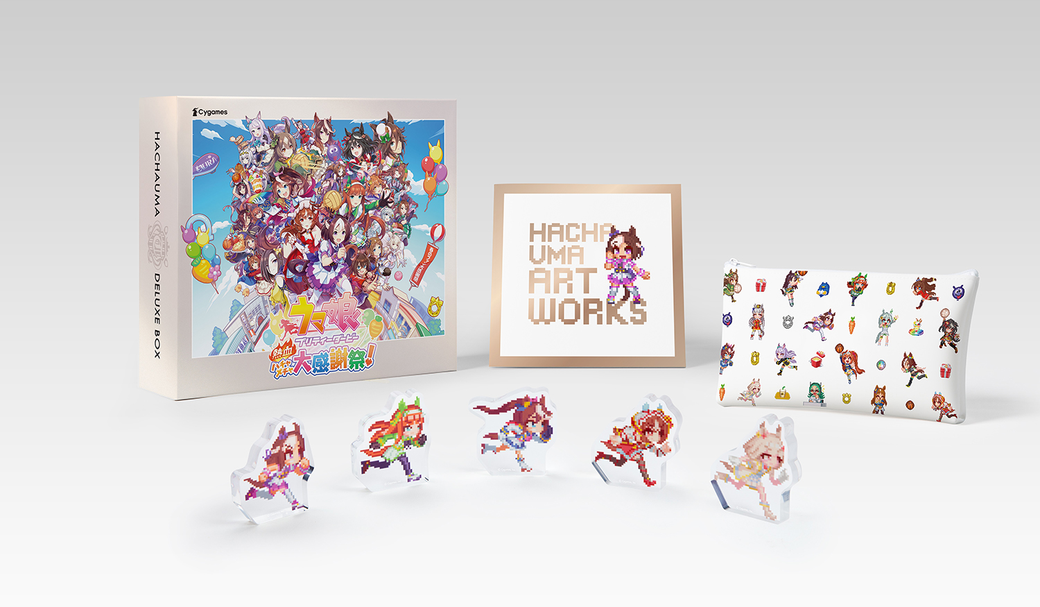 「DELUXE BOX」は通常版にも同梱される「『ハチャウマ』ステッカー」だけでなく、オリジナルグッズの「HACHAUMA BLOCK FIGURE SET」「HACHAUMA SPECIAL POUCH」「HACHAUMA ART WORKS」と、ダウンロードコンテンツ「ウマ娘 プリティーダービー 熱血ハチャメチャ大感謝祭!チームセット」が同梱されることになっている。
