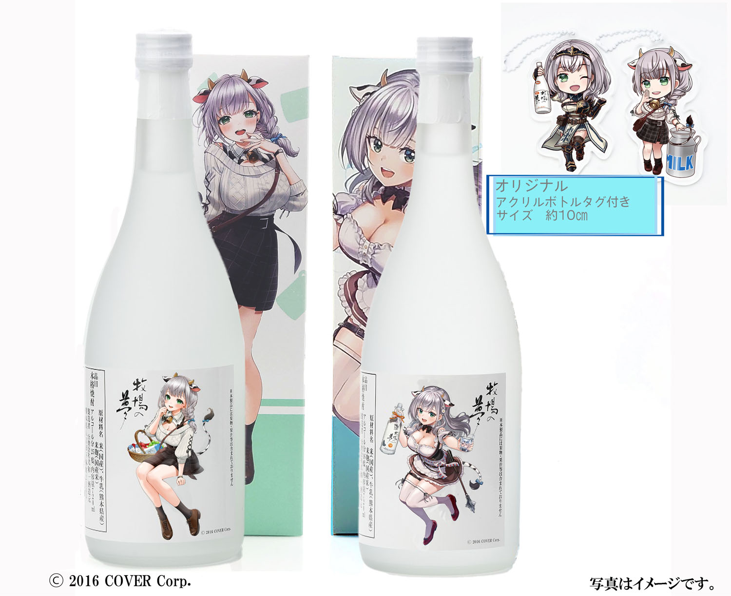 新鮮な牛乳と温泉水、良質な米で作ったアルカリ性焼酎。甘くフルーティな香り、豊かな味わいなスタンダードタイプ。イラストはホロライブの大ファンとして知られるイラストレーターごとーが描いている(写真は合資会社大和一酒造元提供)