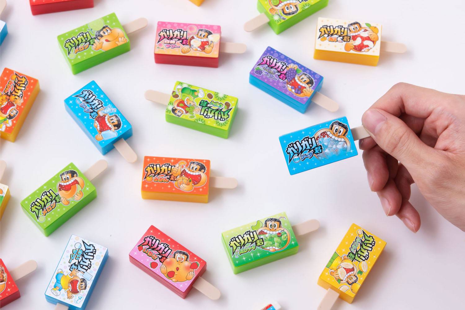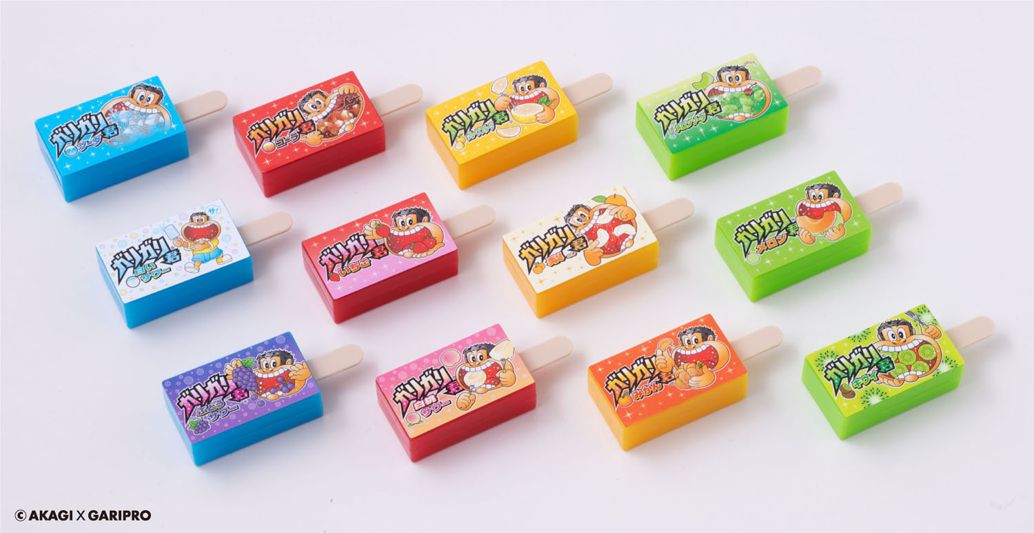 ガリガリ君の「ソーダ味」や「コーラ味」といった見慣れたフレーバーを模した12種類のブロックと、持ち手部分を模したバー24本がセットになっていて、4種類の遊び方が可能となっている。