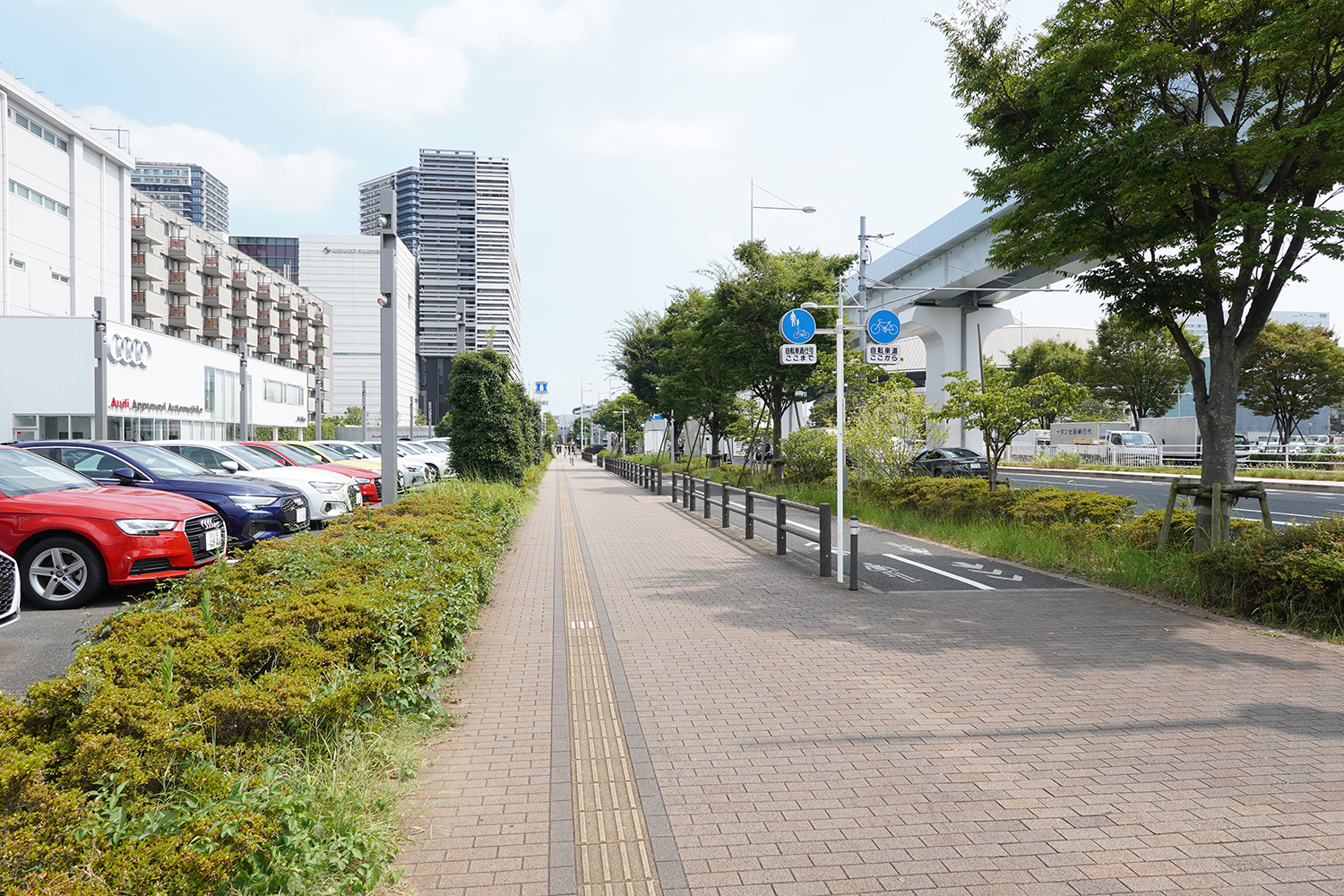 右側にゆりかもめ、左側にアウディのディーラーが見える。この歩道をまっすぐ行けば、東京ビッグサイトにたどり着ける(筆者撮影)