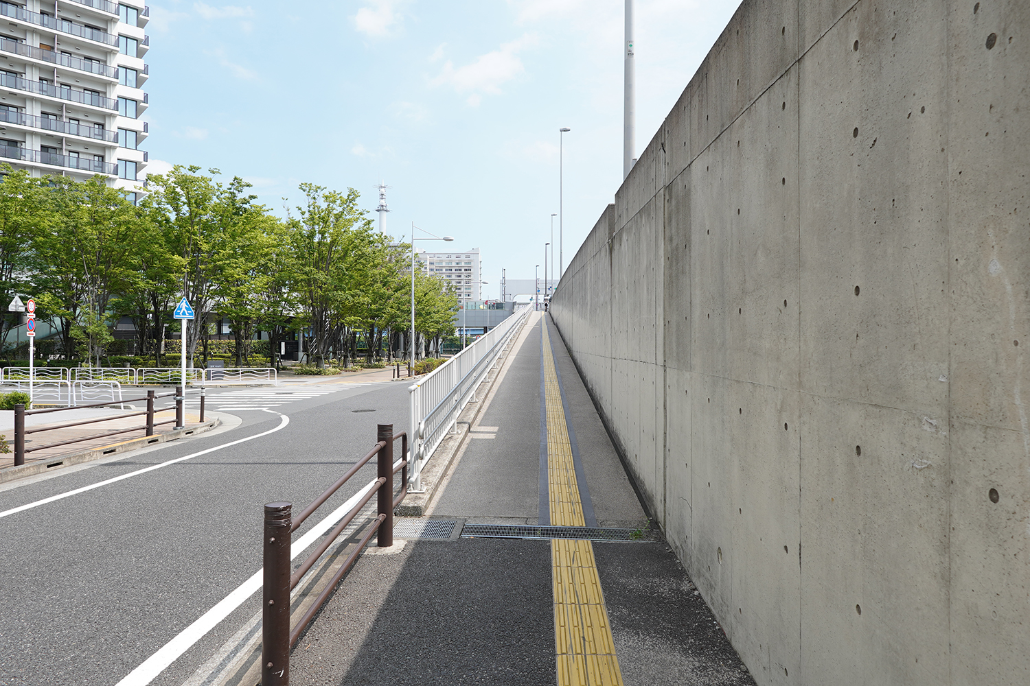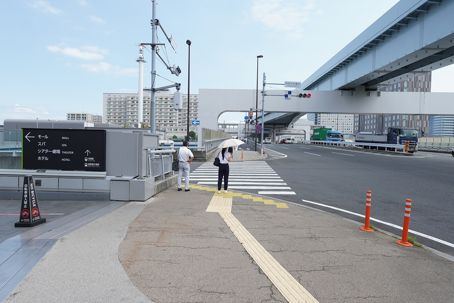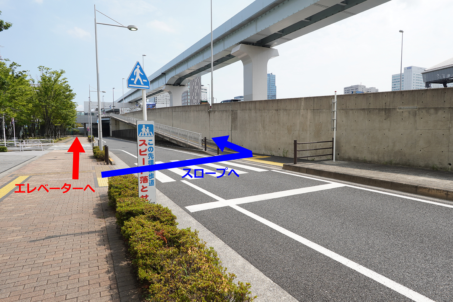 首都高速湾岸線をまたぐ橋では、荷物の量によってスロープかエレベーターが選択できる。右側の横断歩道を渡ればそのままスロープとなる。荷物が多くエレベーターを利用したい場合はこのまま左側の歩道を直進しよう。