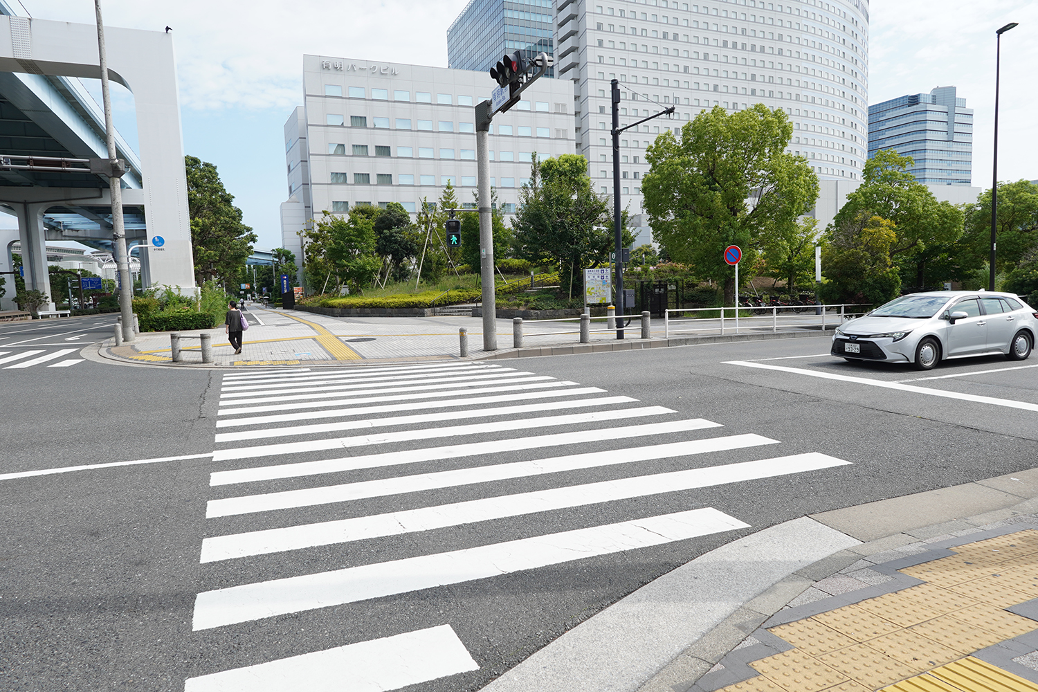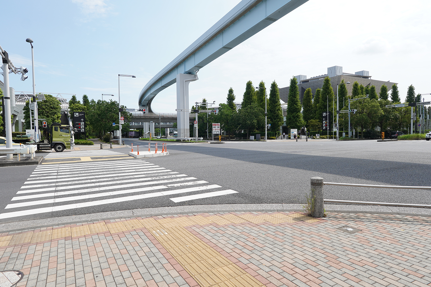 写真はゆりかもめ「有明駅」の交差点。東地区へは直進、西地区へは横断歩道を渡るのが最短経路となる(筆者撮影)