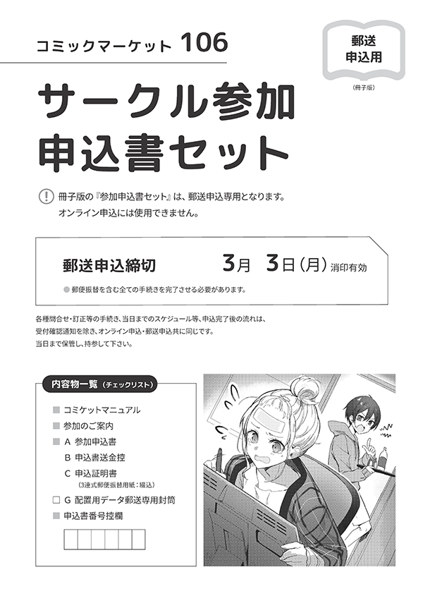 郵送の場合は、まず「サークル参加申込書セット(冊子版)」を購入する必要がある。しかし、サークル参加申込書セット(冊子版)は25年2月17日までしか販売されていないため、すでに手元にない人は、ネットから申込を行おう。