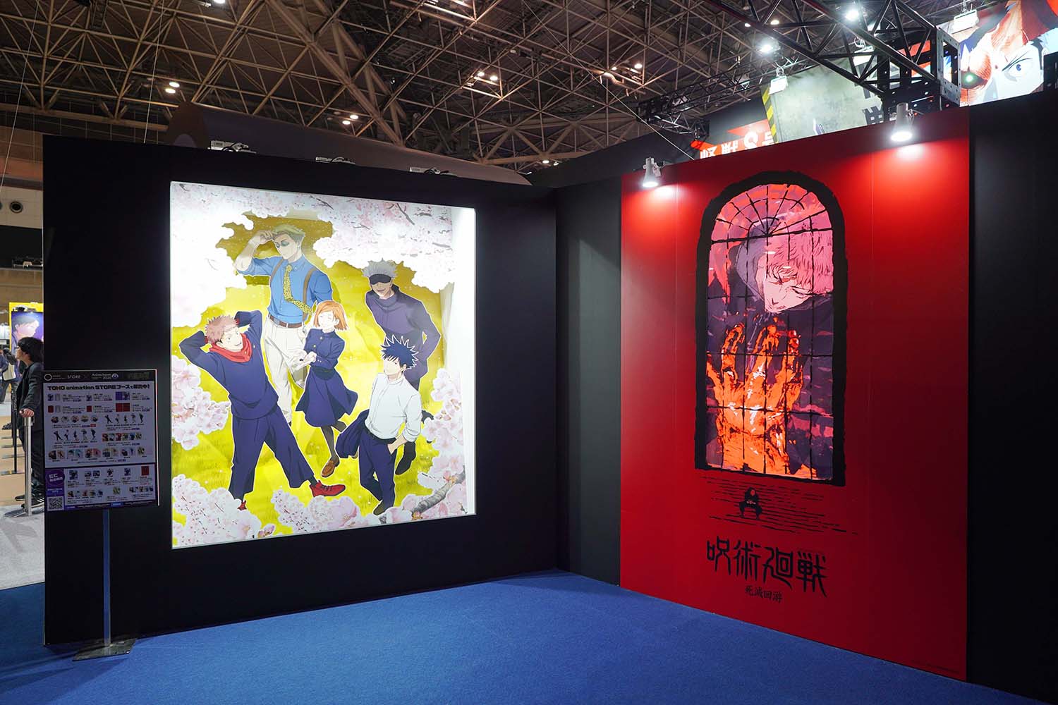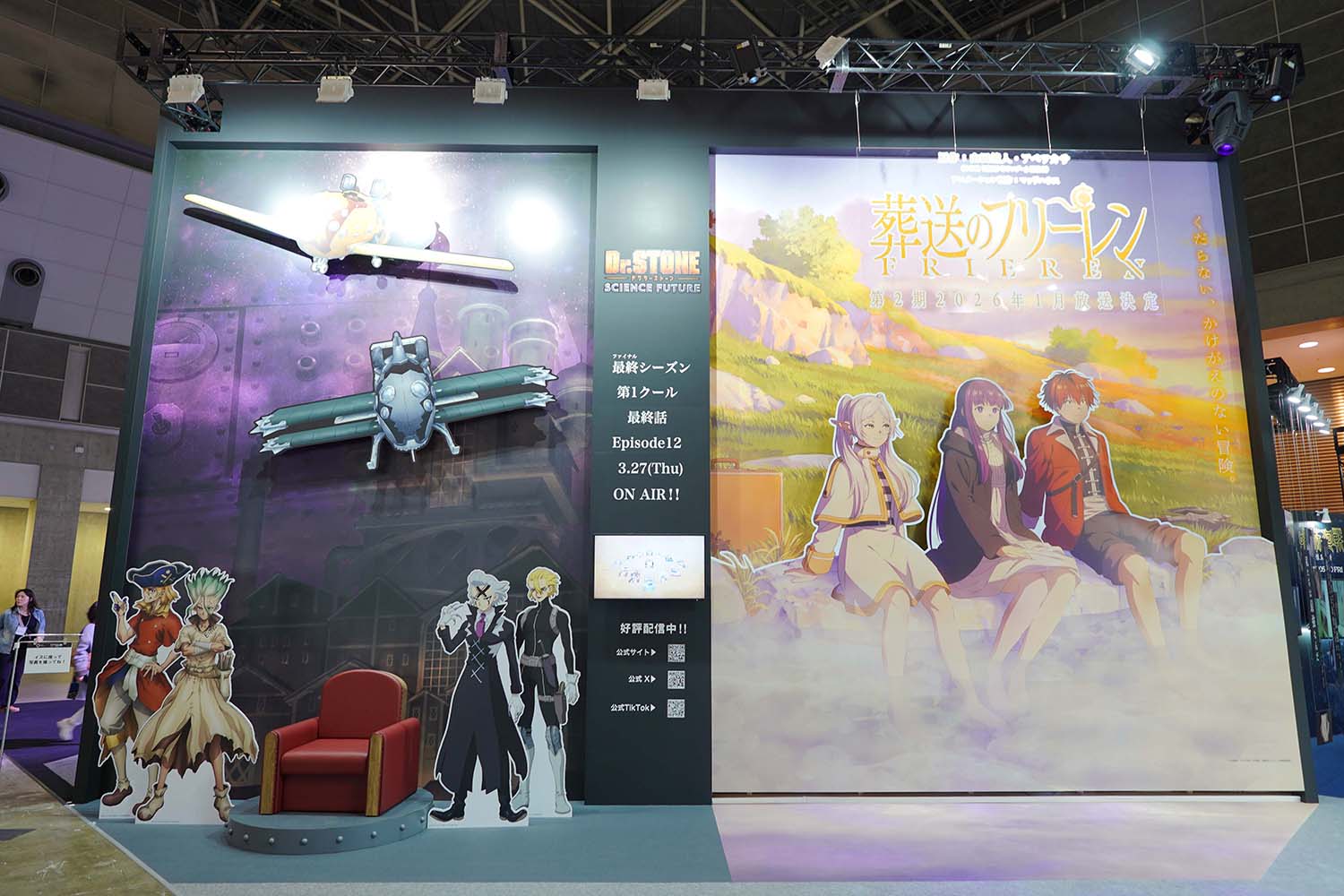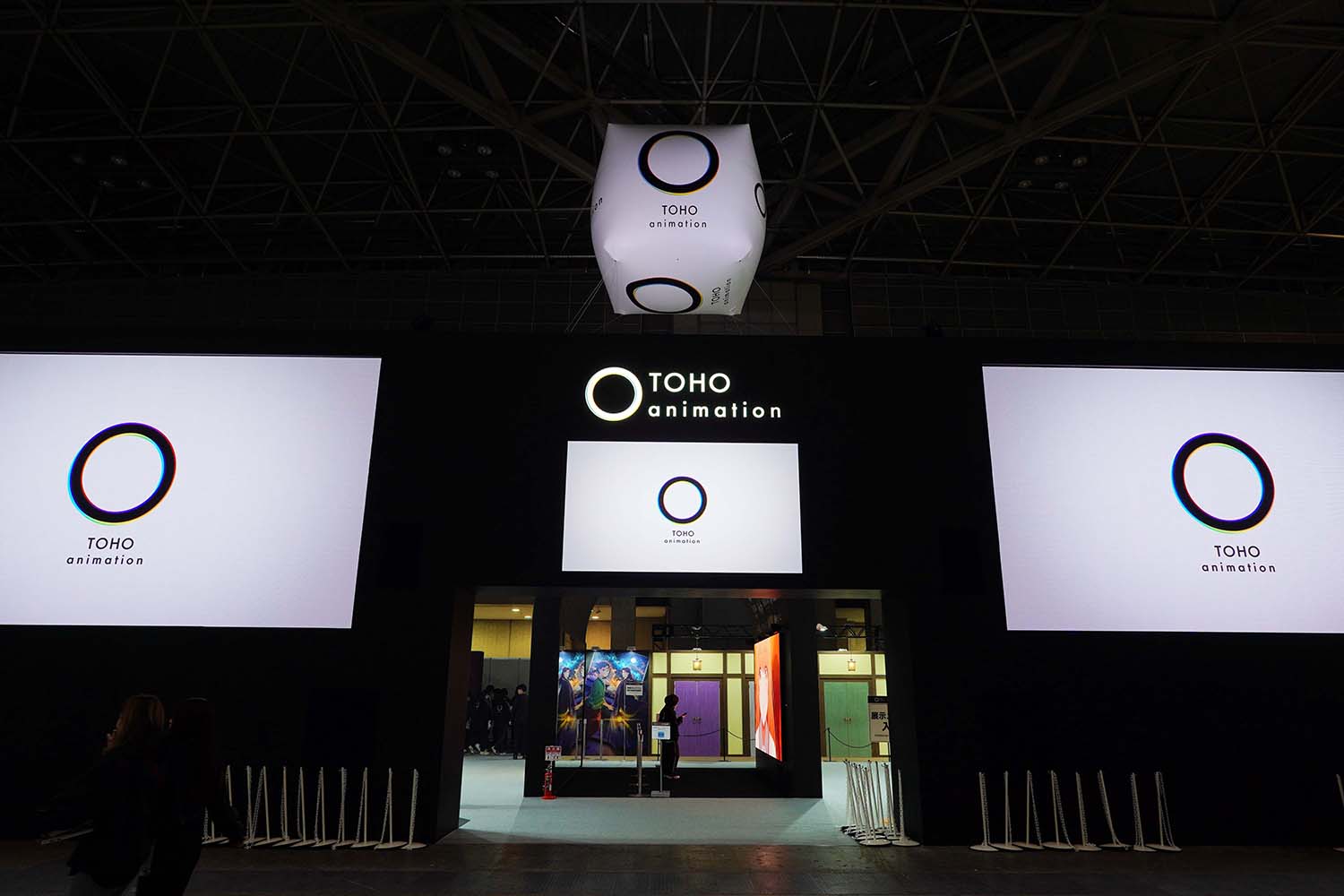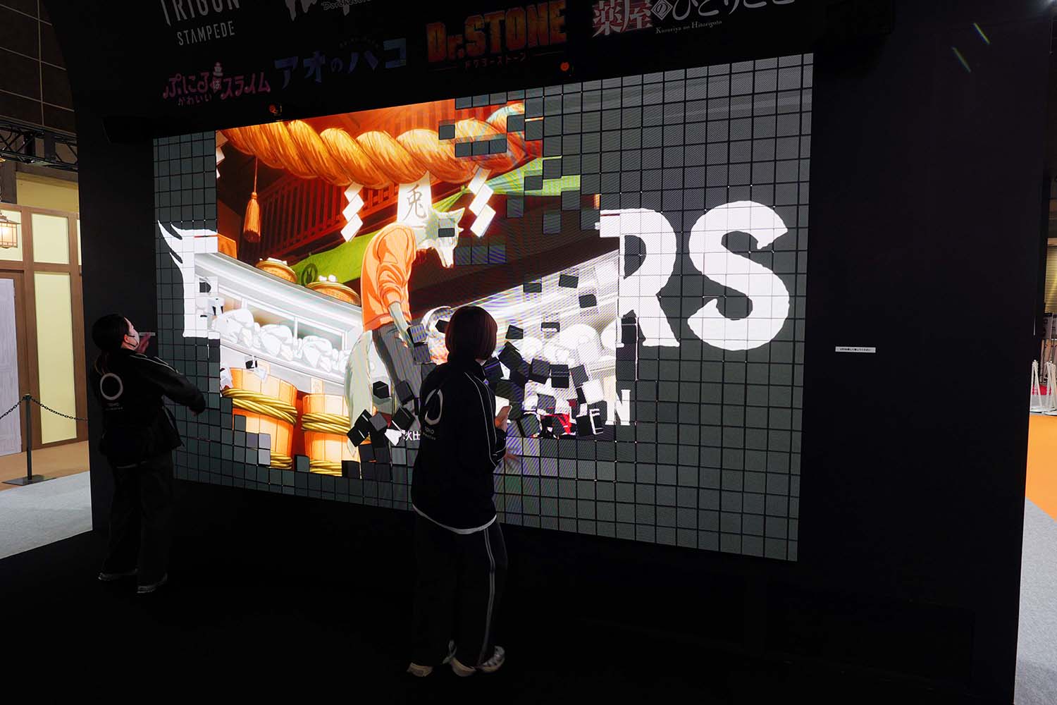 『僕のヒーローアカデミア』『葬送のフリーレン』『薬屋のひとりごと』など、人気作品を数多く発信している「TOHO animation」。ブース入り口には左右に巨大なスクリーンを展開し、そこに映し出されたブロックに触れると、ブロックが崩れてキービジュアルが出現するという派手な演出があった。