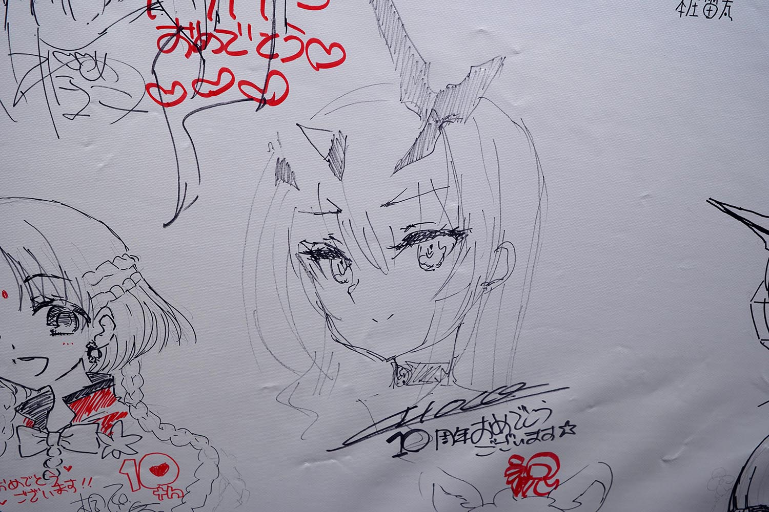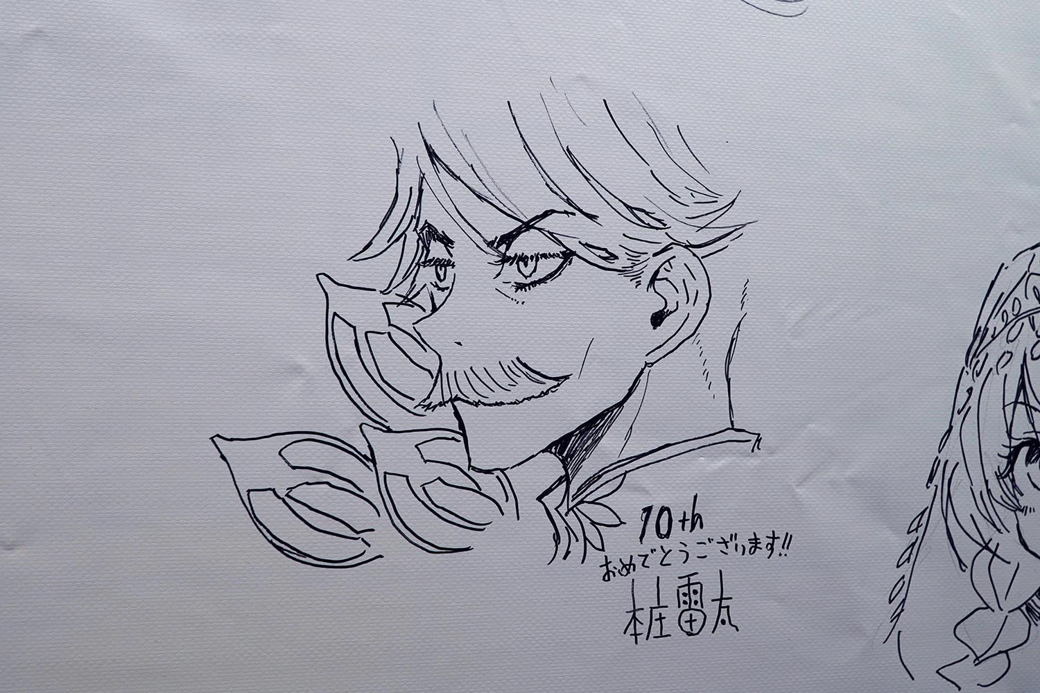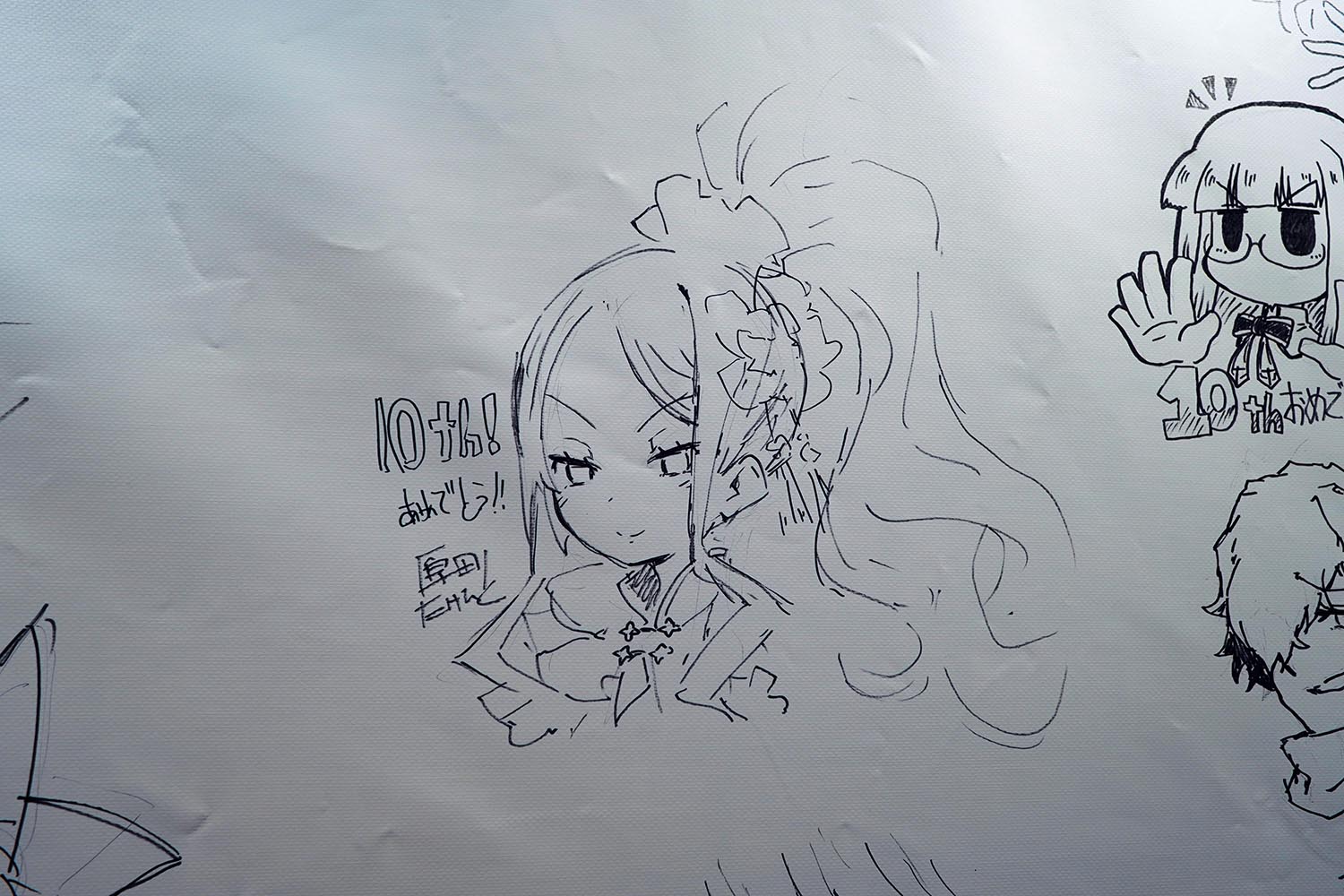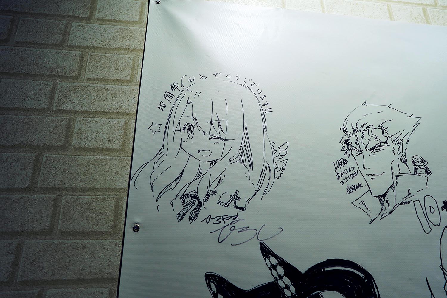 奈須きのこさんと武内崇さんのメッセージフラッグ。両日とも直筆のメッセージとなる。ファンならしっかりと目に焼き付けておこう(筆者撮影)