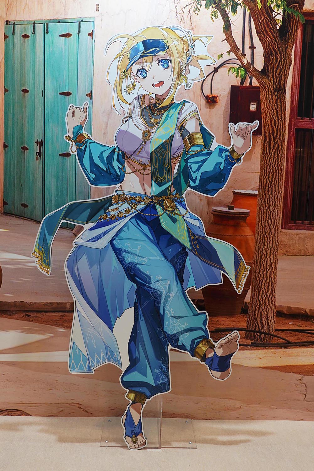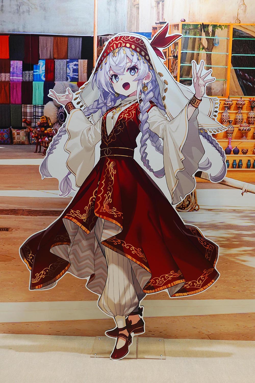 オリエンタルバザールというエリア名なので、サーヴァントもオリエンタルな衣装に身を包んでいる。また、人気のグッズは午前中には売り切れてしまうほどの盛況ぶり(筆者撮影)