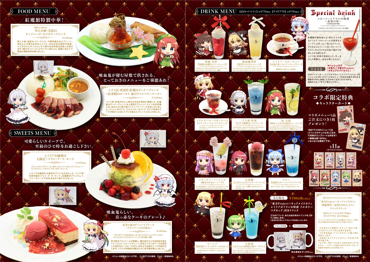 また、条件を満たした場合のみ注文ができるスペシャルドリンク「スカーレットデビルの晩餐~血染の杯~(ちぞめのさかずき)」も準備中。気になる条件は、SNS(Twitter、Instagram、Facebook)にハッシュタグ「#東方」「#東方Project」「#キュアメイドカフェ」をつけてコラボメニューや店内の様子がわかる画像を投稿するというもの。SNSをやっている人なら今すぐ参加してみてはいかが?