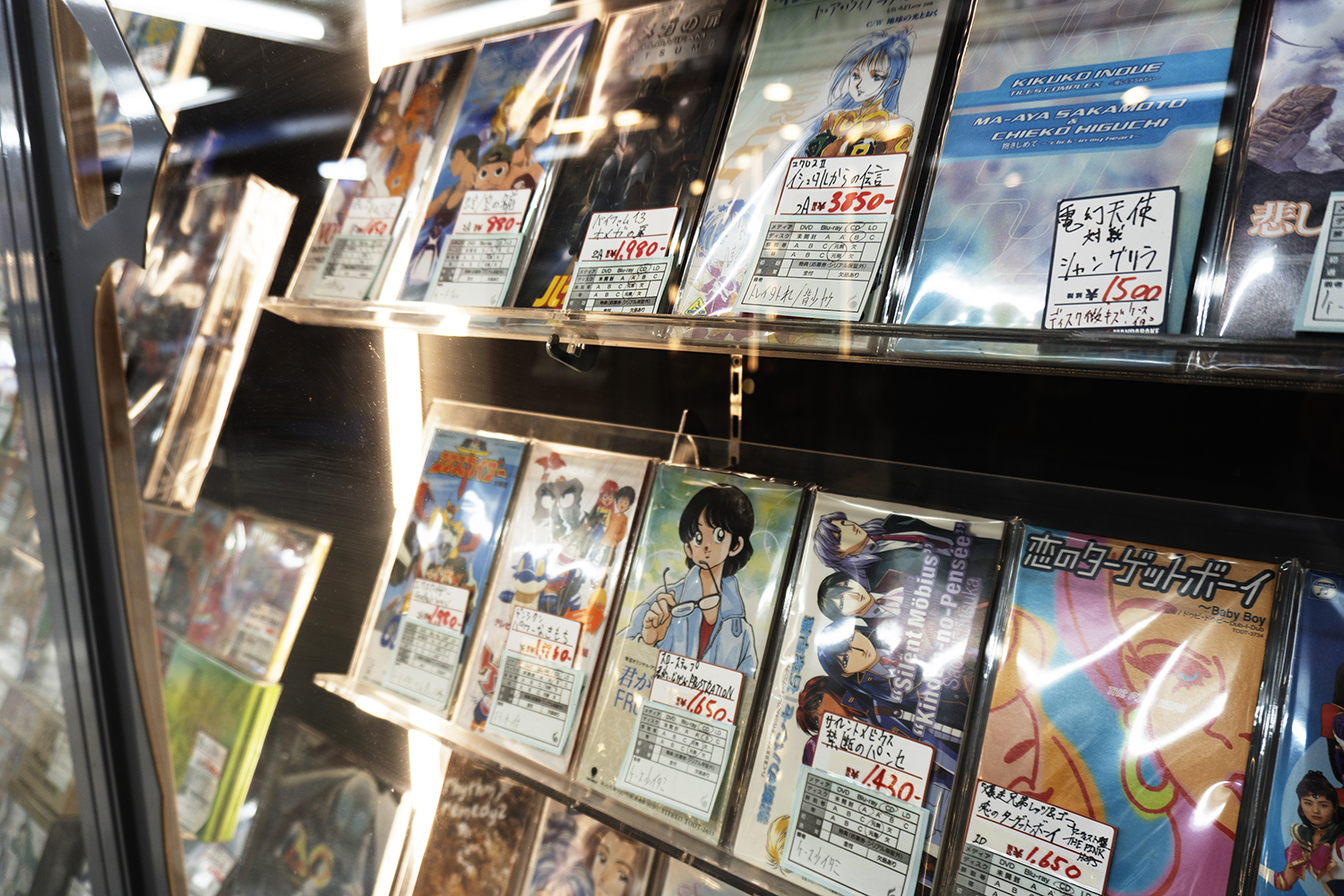 ショーケース内に展示されたアニメのサントラCD。2000年代初頭まではアニメのBGMやドラマCDなども発売されており、スピンオフ的な楽しみ方ができた(筆者撮影)