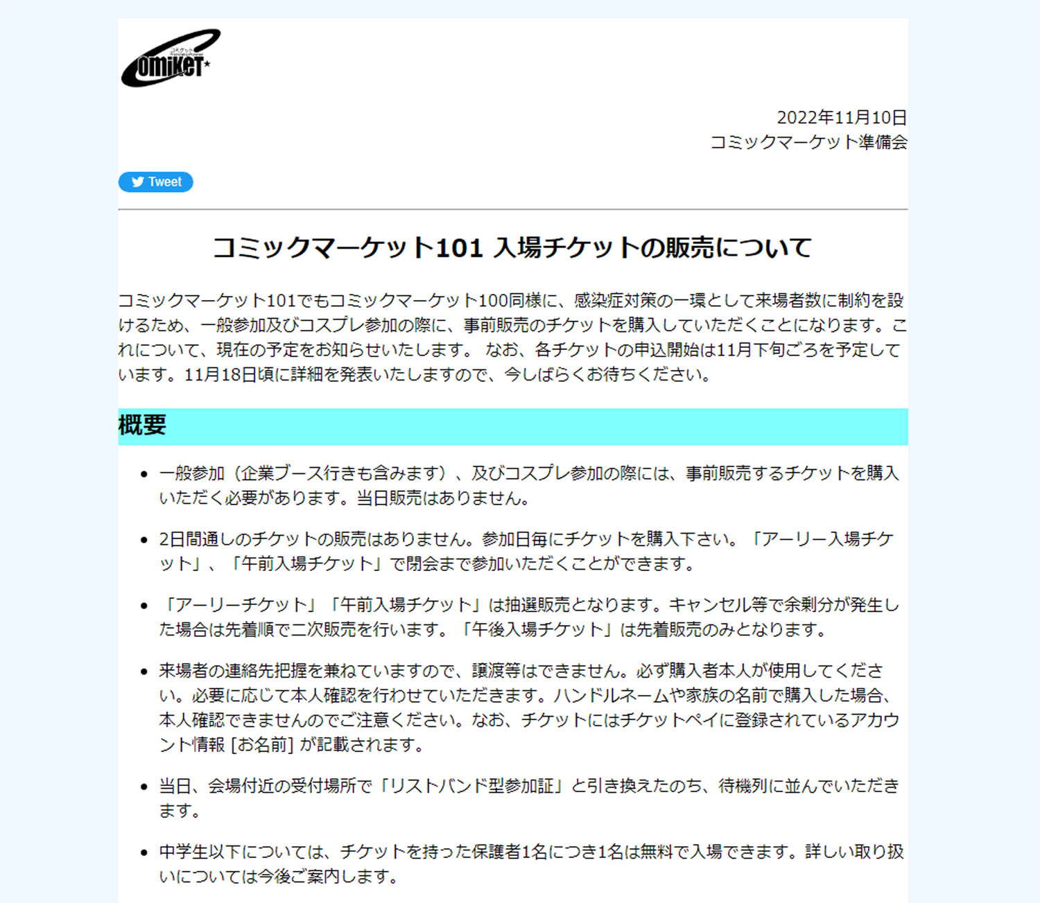 こちらが11月10日、コミックマーケット準備会が発表した「コミックマーケット101 入場チケットの販売について」(画像はコミックマーケット公式サイトより転載)