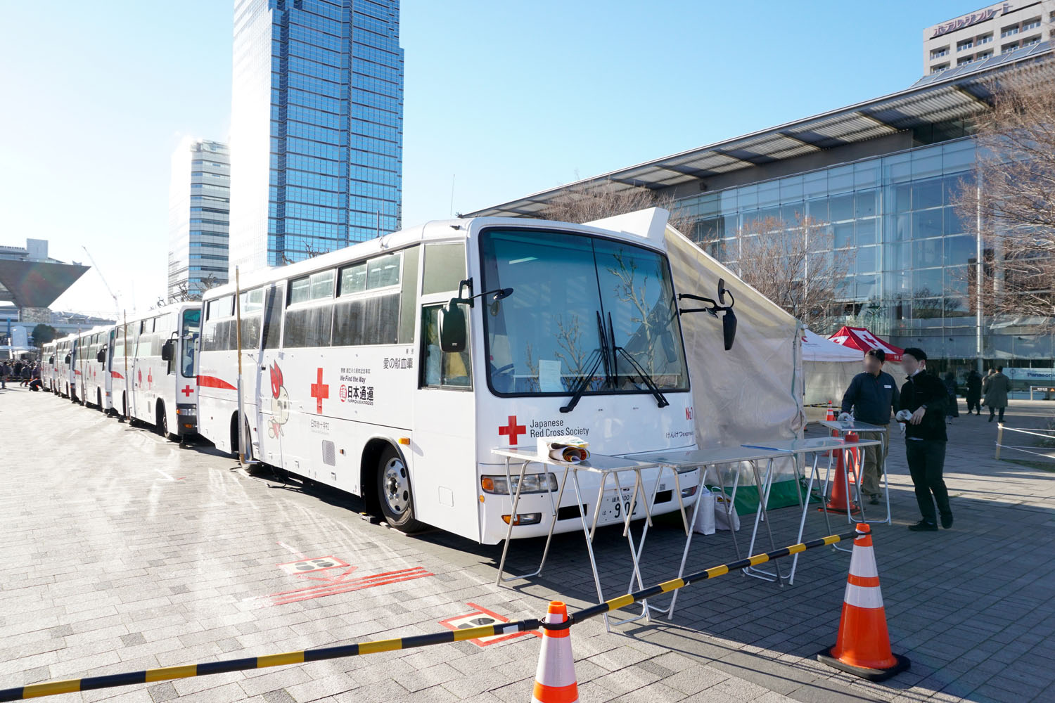 C101の期間中は、東京ビッグサイト前のセンタープロムナードにあるパナソニック前に献血車が並ぶ予定だ(筆者撮影)