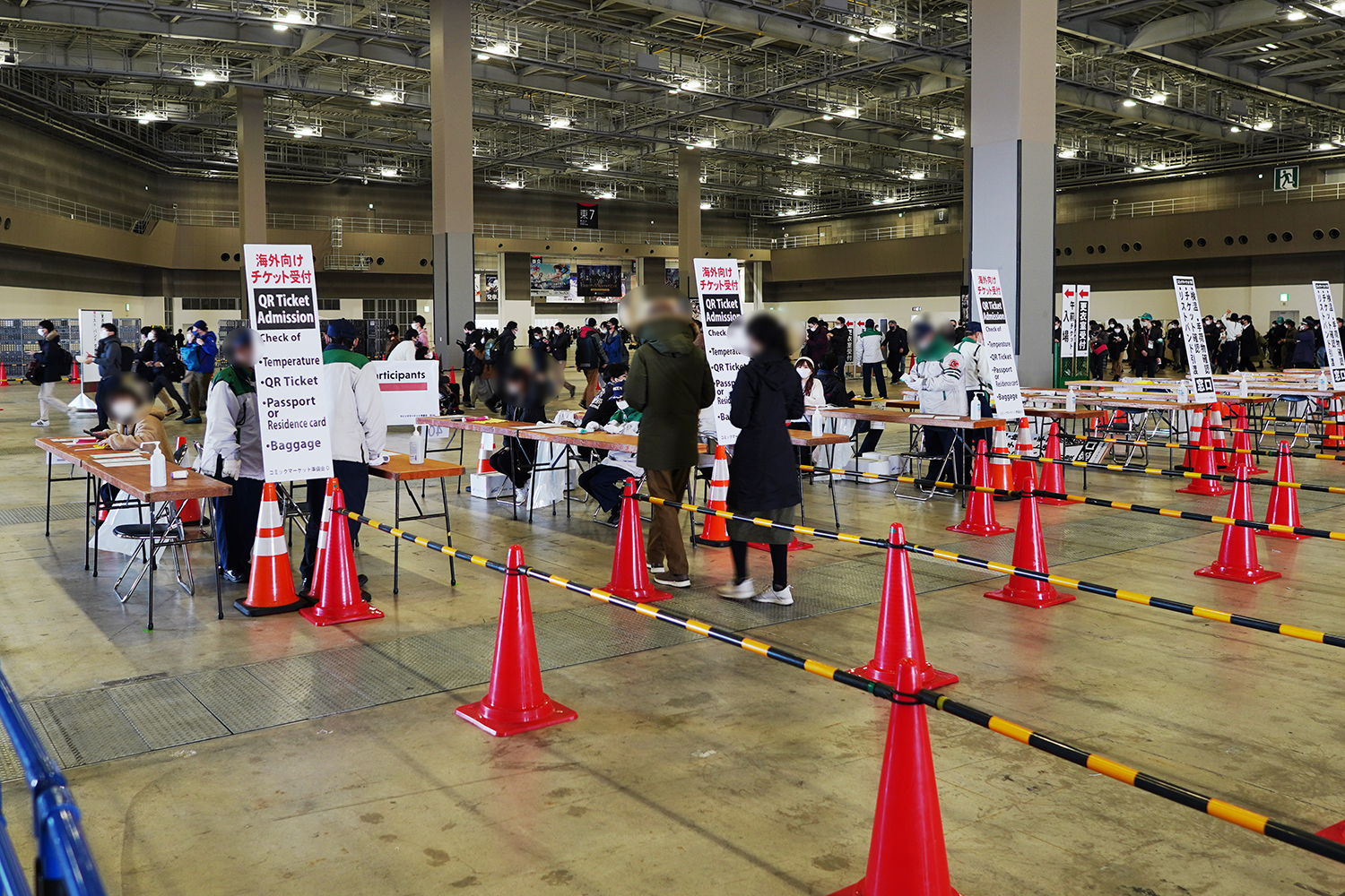 また、C101では海外在住者向けチケットも販売されたが、このチケットの受付は東7ホールのみに集約されていた。一般参加者のチケットとは仕様が異なるため、検温&チケット交換ブースでは英語の立て看板があり、専用レーンが設置されていたのである。