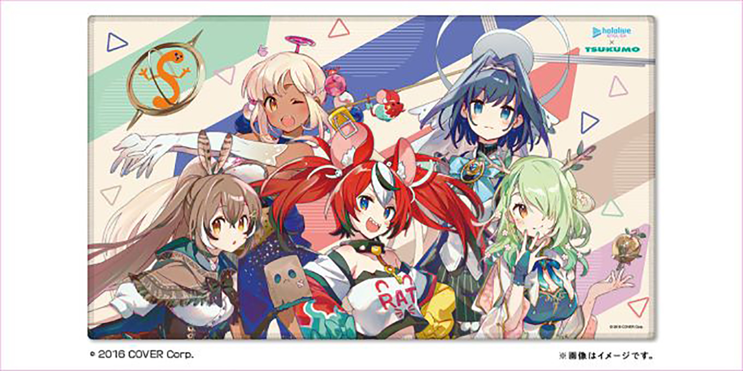 ホロライブEN2期生のデスクマット。全員が集合した九十九佐命の描き下ろしイラストに注目!(画像はTSUKUMOより提供)
