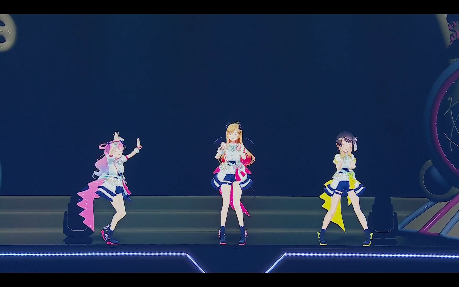 パフォーマンス直後のMCで喜びを爆発させるスバチョコルーナの3人(画像はホロライブより提供)